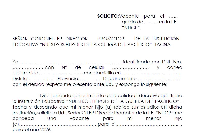 Somos una Institución Educativa Pública de gestión privada, La I.E «Nuestros Héroes de la Guerra del Pacífico» que brinda educación a estudiantes de la comunidad de Tacna, del distrito de Tacna, que hablan lenguaje castellano y provienen de familias dedicadas a actividades económica, también atienden a familias militares civiles por la cercanía, ubicación geográfica y por la demanda educativa.